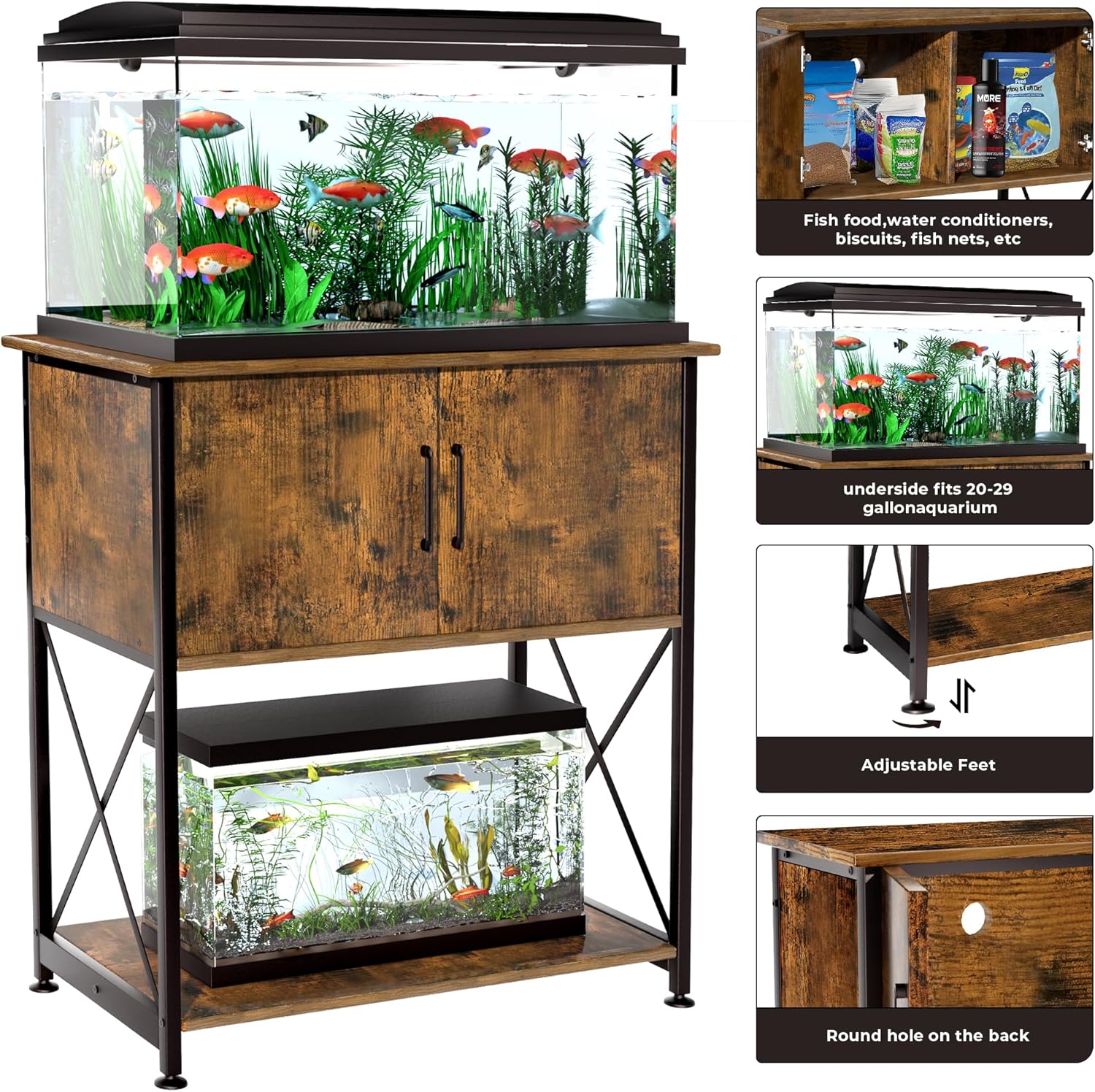 - 2 in 1 Space Design: Stand is designed with two levels for fish tank placement, the desktop can accommodate differently shaped 20-29 gallon fish tanks, and the bottom can also hold small 5-10 gallon fish tanks. This structure raises the height of the fish tank to a more comfortable viewing height while maximizing the use of limited space. It keeps your fish tank storage neat and tidy.