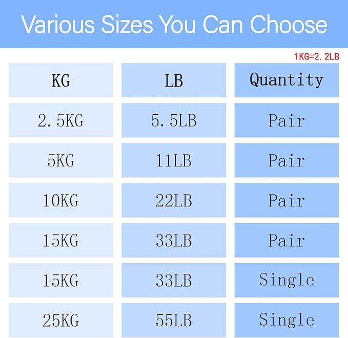 - SIZES YOU CAN CHOOSE:There are 5 sizes you can choose including 2.5kg,5kg,10kg,15kg,25kg.2.5kg dumbbell head:1.97"x2.71", total length: 9.85"x2.71",5kg dumbbell head:2.52"x3.47",total length: 10.94"x3.47",10kg dumbbell head 2.91"x3.97",total length: 11.72"x3.97",15kg dumbbell head 3.66"x5.1",total length, 13.22"x5.1",25kg dumbbell head:4.3"x5.9",total length: 14.5"x5.9".