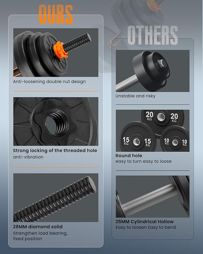 - 【DURABLE MATERIALS】The dumbbell pieces exterior is made of high-quality PE materials, which prevents floor abrasion,Safe and secure, soundproof. Contains concrete formed by a mixture of cement and iron sand, which effectively zero leakage and real weight