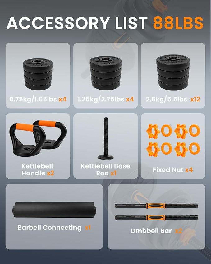 - 【WHAT YOU GET】NOTE: If there is a problem with the nut you received, please contact us in time and we will send you a new nut. Package includes 4 x 0.75kg/1.65lbs Dumbbell plates, 4 x 1.25kg/2.75lbs Dumbbell plates,12 x 2.5kg/5.5lbs Dumbbell plates, 1 x Connecting Rod, 2 x Dmbbell Bar, 2 x Kettlebell Handle, 1 x Kettlebell Base Rod, 4 x Fixed nut. If you have any questions about the products, please contact our customer service team