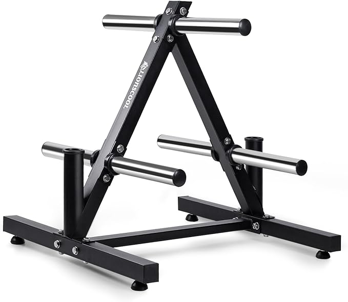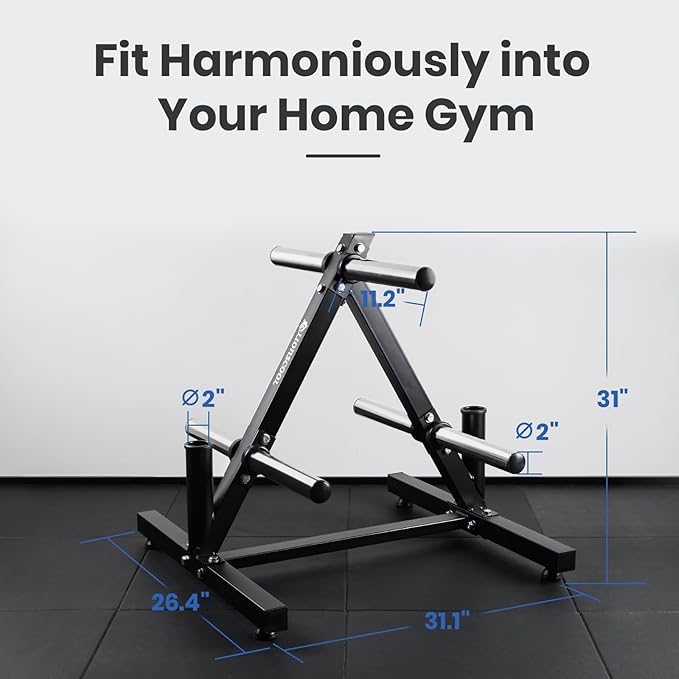 - Multipurpose, Sleek and Space Saving: The plate tree is equipped with two sturdy barbell holders to fit 2-inch barbells. Both have plastic inserts securely attached and rubber pads to put at the bottom to prevent your barbell sleeves from scratching. Each post measures 11.2”, long enough to hold 4x45lb bumper plates. The whole frame is matte black powder coated, rust resistant and visual appealing. The total size of the tree is 31.1”x26.4”x33.7” (with wheels) / 31.1”x26.4”x31” (no wheels).