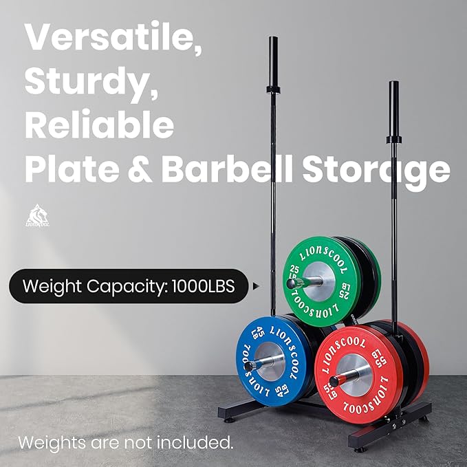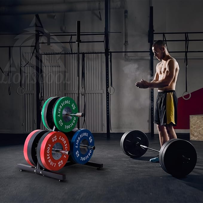 LIONSCOOL 2-Inch Olympic Weight Plate Tree and 2 Barbell Holders, Bumper Plate Storage Rack with Optional Wheels, 650LBS/1000LBS Weight Capacity Available