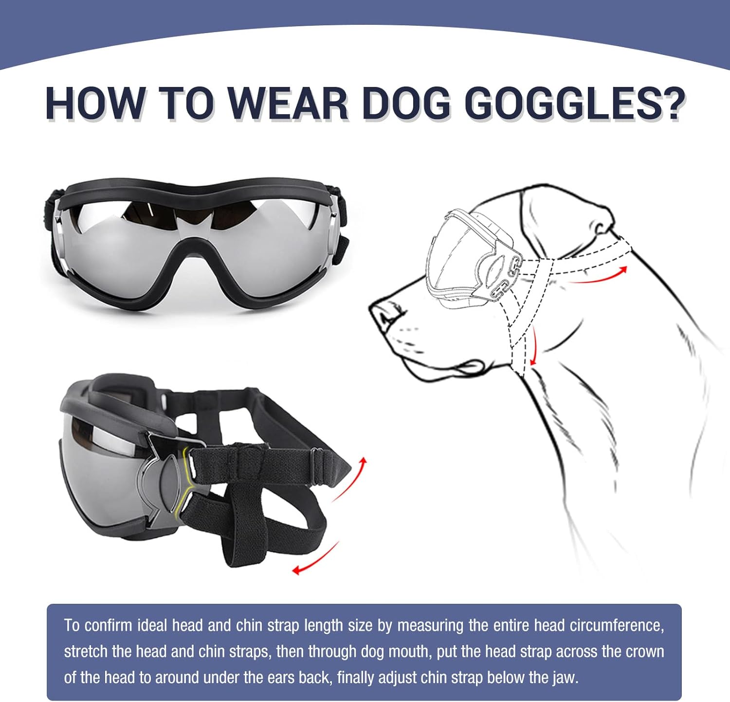 - Size Information: Head Elastic Straps: ≤14", Chin Elastic Straps: ≤9". (No Tensile Measurement). dog need take some getting used to in generally, you can distract with treats until he was used to wearing goggles.