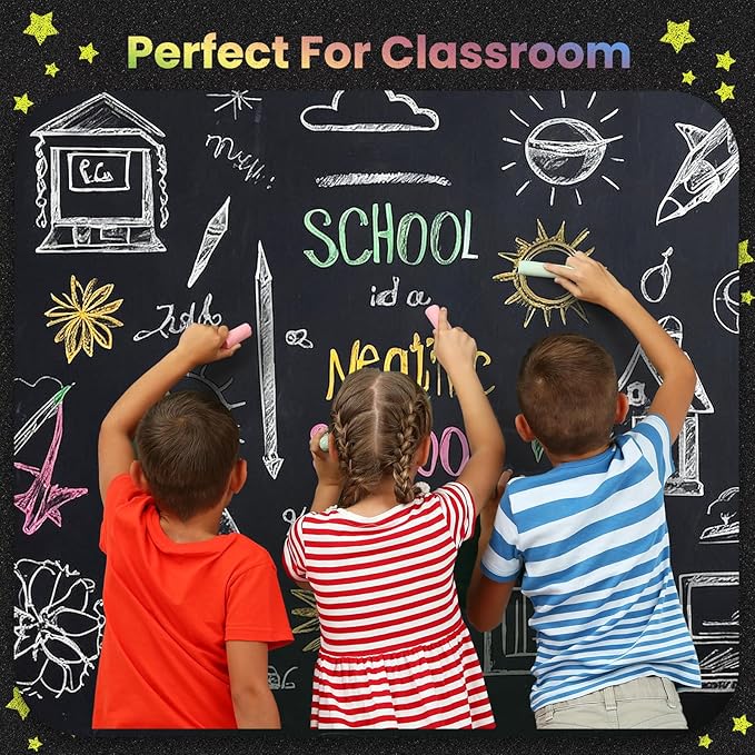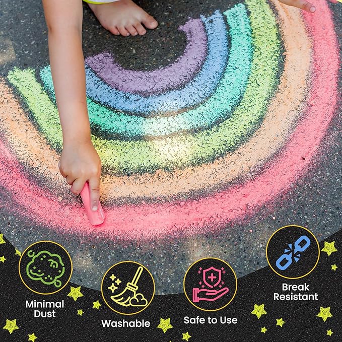 - Child-safe Materials: The chalk is made of non-toxic materials. It is highly pigmented and not easy to fade. It complies with American toy standards. You can buy it for your children with confidence. The sturdy design of the jumbo chalk is not easy to break and is durable. The chalk size is 4.1*0.9in, it is large enough to be easily grasped by little hands and create amazing patterns at will. Chalk can be washed off any surface, so don't worry if you get it on yourself, just enjoy your doodle game!