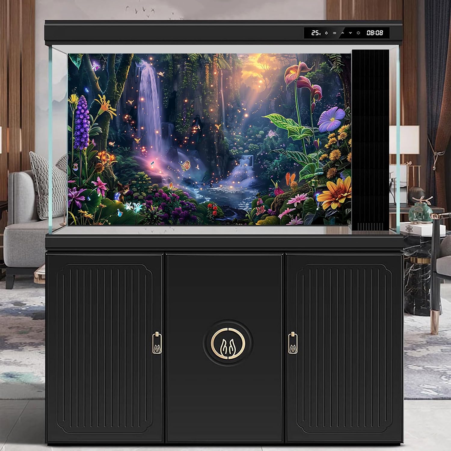 Fantasy Garden Aquarium Background Sunset Waterfall and Flowers Terrarium Backdrop Tropical Forest Lush Plant Magic Butterfly Lights Flowers Fish Tank Background Poster Decorations 30x18in