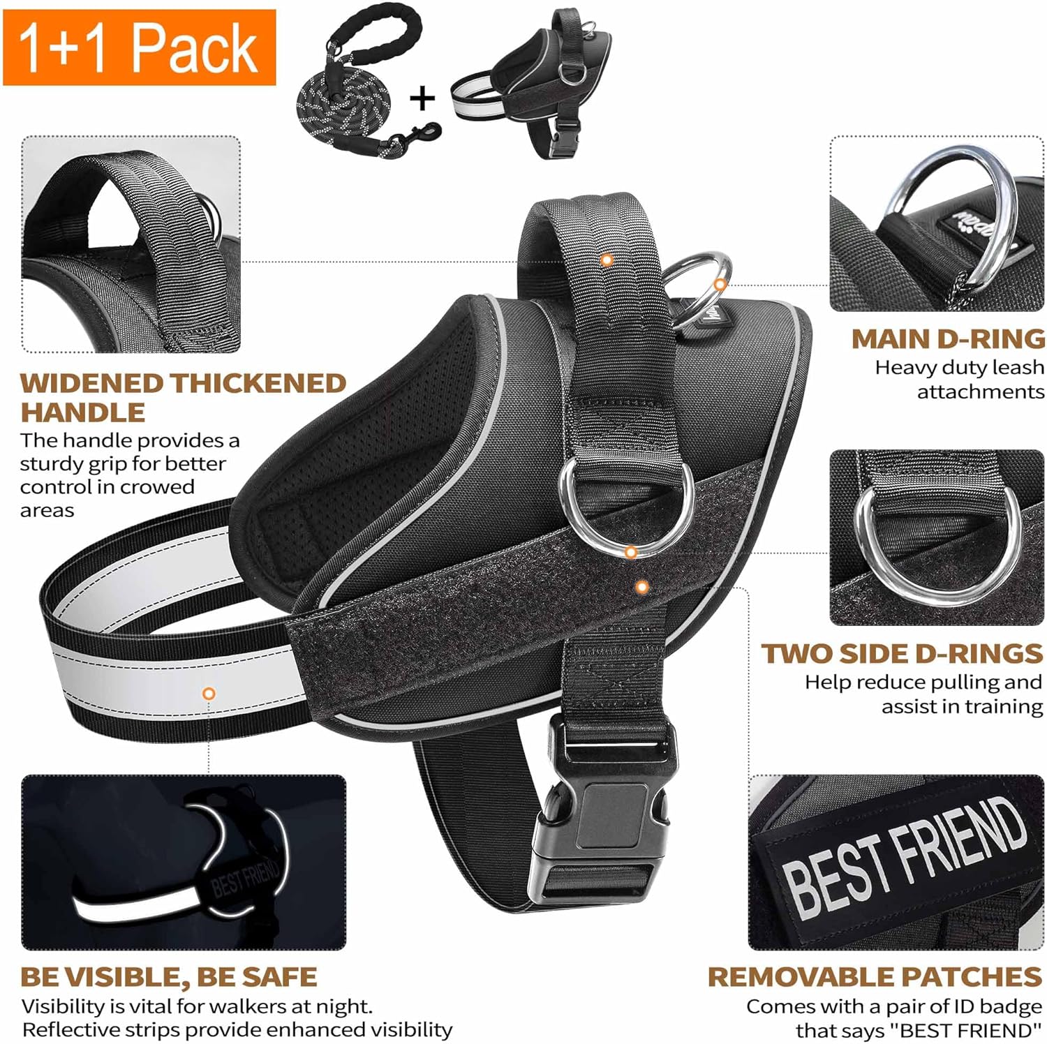 Haapaw Essential Dog Harness, No Pull Pet Vest with 3 Leash Clips, No Choke, Reflective, Adjustable and Padded, for Easy Walking and Training for Large Dogs(XL, Black)