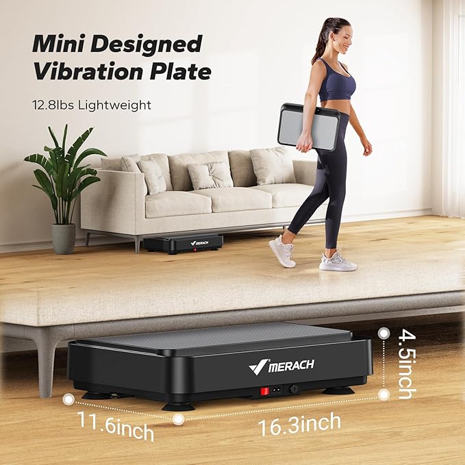- [COMPACT DESIGN] This mini vibration plates adopts a compact design, which is easy to carry and store. When not in use, you can put it under the sofa or bed to save space. The product weighs only 12.8 pounds, and you can easily move it without putting any effort.