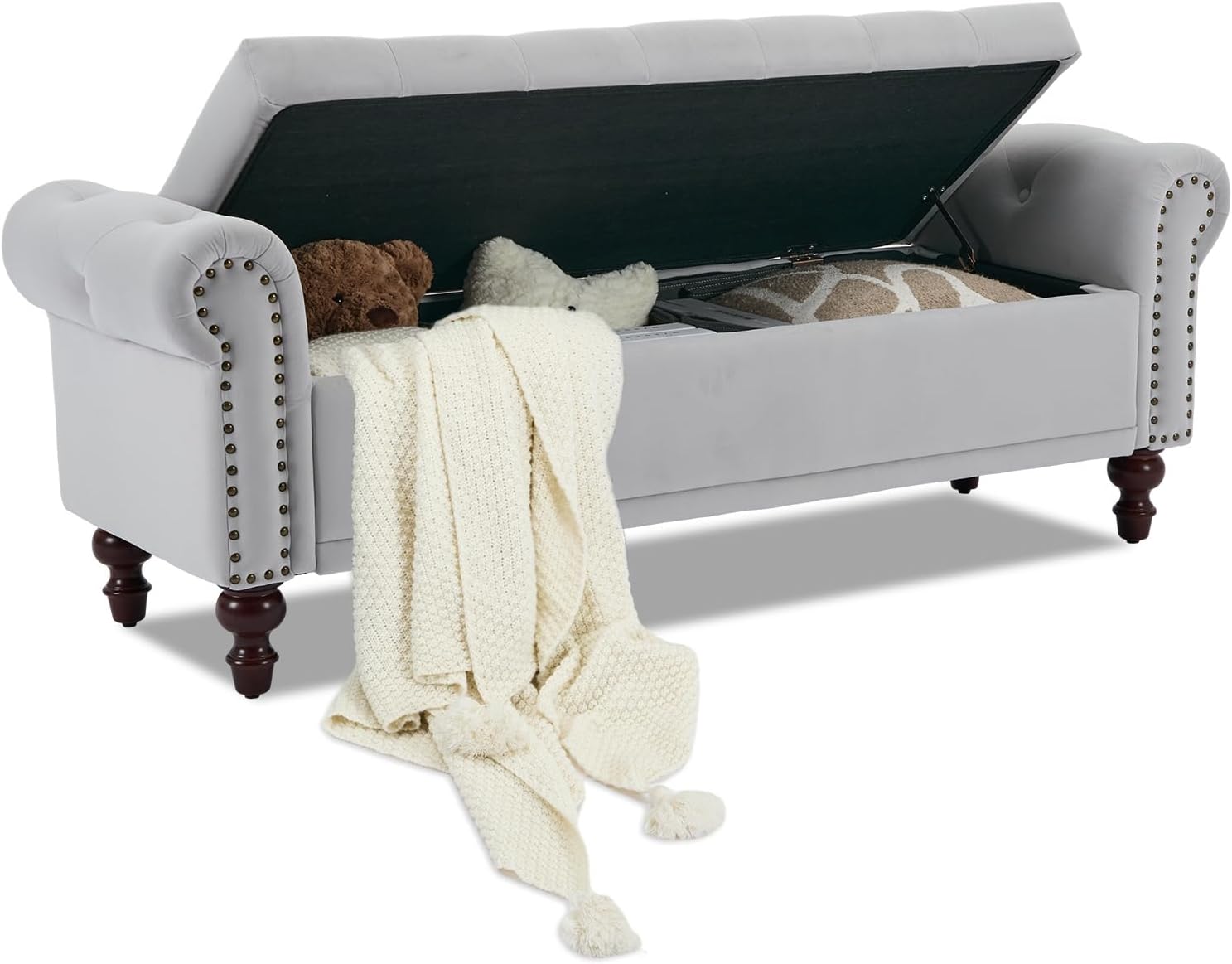 Storage Bench Upholstered Velvet End of Bedroom Bed Bench Ottoman with Tufted Cushioned Rolled Arm Large Storage Space for Reading Living Room Entryway, Light Grey