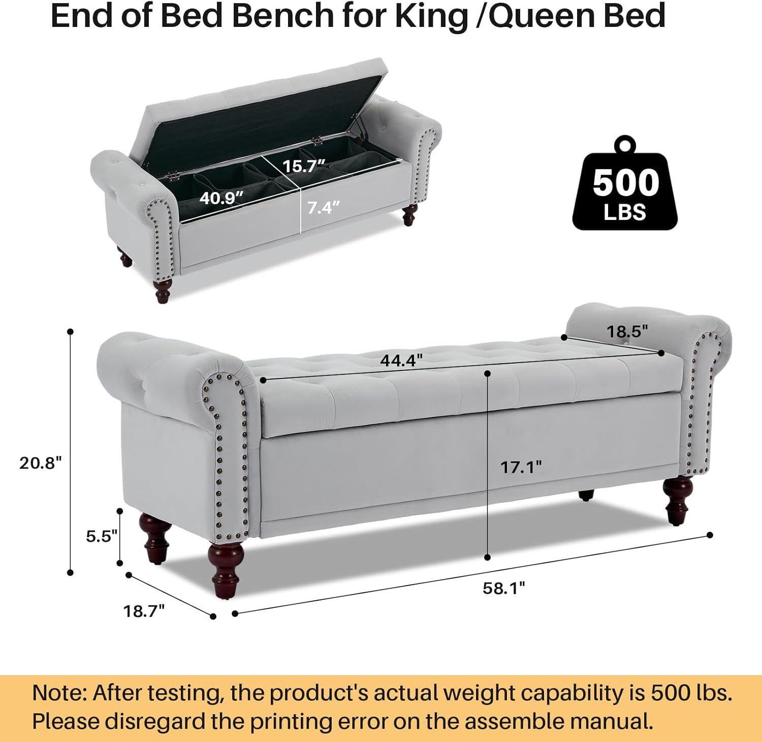 - EASY ASSEMBLY: The This storage bed bench overall size is 58.1" W x 18.7"D x 20.8" H. The cushioned bench is pre-assembled 80% and will come with a manual and installation tools to assemble it, it's simple and convenient.