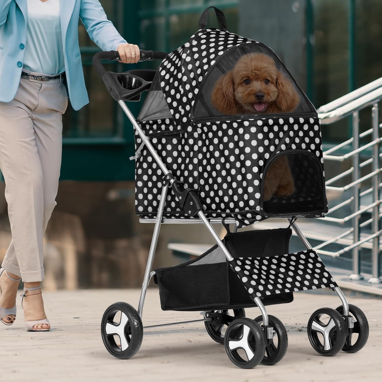 Magshion Foldable Pet Stroller, 3-in-1 Dog Travel Jogger with Detachable Carrier, Cup Holder, Storage Basket, Folding Carrier for Small/Medium Dogs & Cats Up to 33 lbs, Black Polka Dots