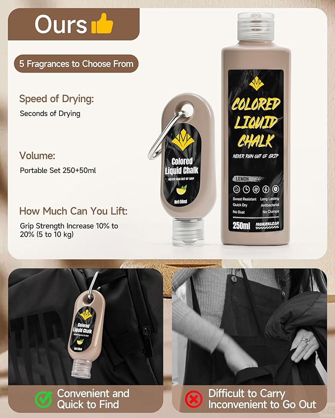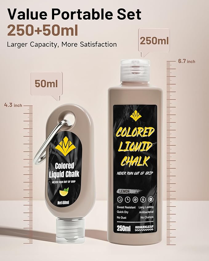 • 𝐅𝐫𝐞𝐬𝐡 𝐒𝐜𝐞𝐧𝐭𝐬 & 𝐏𝐨𝐫𝐭𝐚𝐛𝐥𝐞 𝐂𝐨𝐧𝐯𝐞𝐧𝐢𝐞𝐧𝐜𝐞: MANUEKLEAR Liquid Chalk includes a 250ml bottle plus a handy 50ml travel size. Choose from refreshing blueberry, lemon, or mint scents for a fresh experience. The small bottle clips with a carabiner onto your bag or gear, making it perfect for workouts at the gym, home, or on the go!