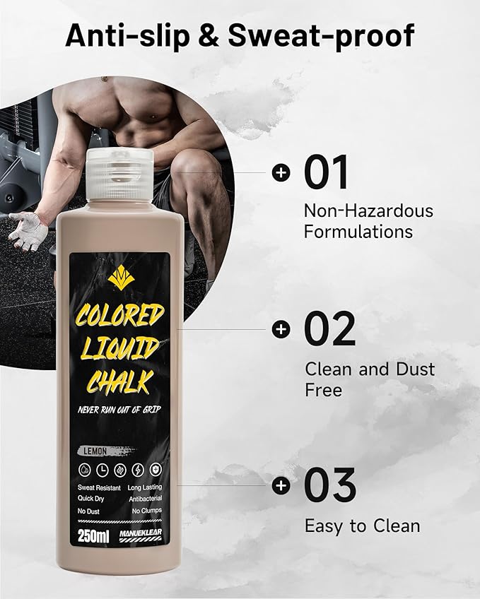 • 𝐈𝐦𝐩𝐫𝐨𝐯𝐞𝐝 𝐆𝐫𝐢𝐩 𝐟𝐨𝐫 𝐏𝐞𝐚𝐤 𝐏𝐞𝐫𝐟𝐨𝐫𝐦𝐚𝐧𝐜𝐞: Just a small drop of MANUEKLEAR liquid chalk enhances your grip, preventing slips caused by sweat or oil. With a long-lasting, strong grip, you’ll feel more confident and focused during your workouts. Boost your performance in lifting, climbing, or any grip-intensive activity, knowing your hands will stay dry and secure.