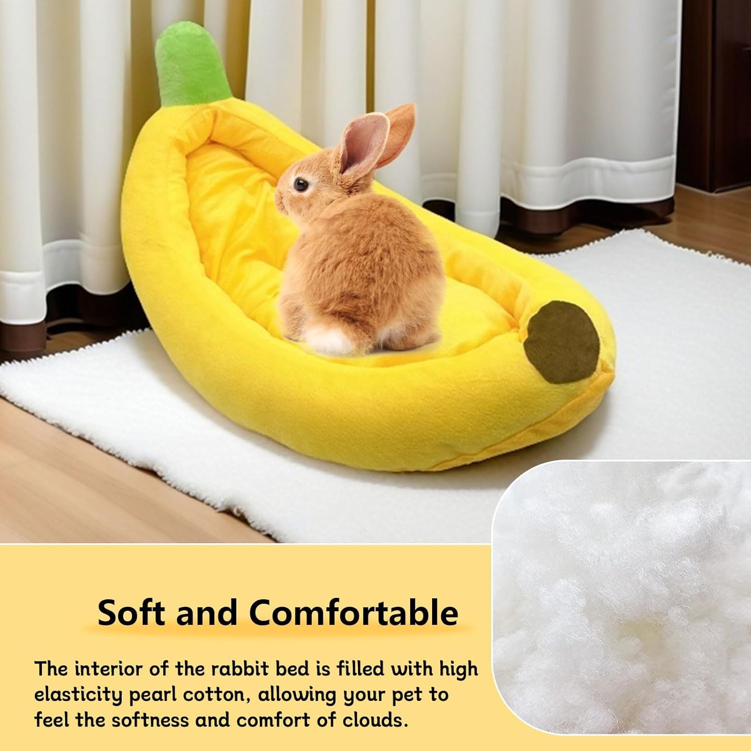 - 🐇[Cartoon Design] Banana shaped small animal bed is cute and vivid, brighten up your home space and touch your heart with your beloved pet. This pet bed is not only suitable for rabbits, but also ideal for guinea pigs, chinchillas and other small pets. You can place it in the cage, on the floor, on the sofa or any indoor space to create a cozy resting place for your pet.