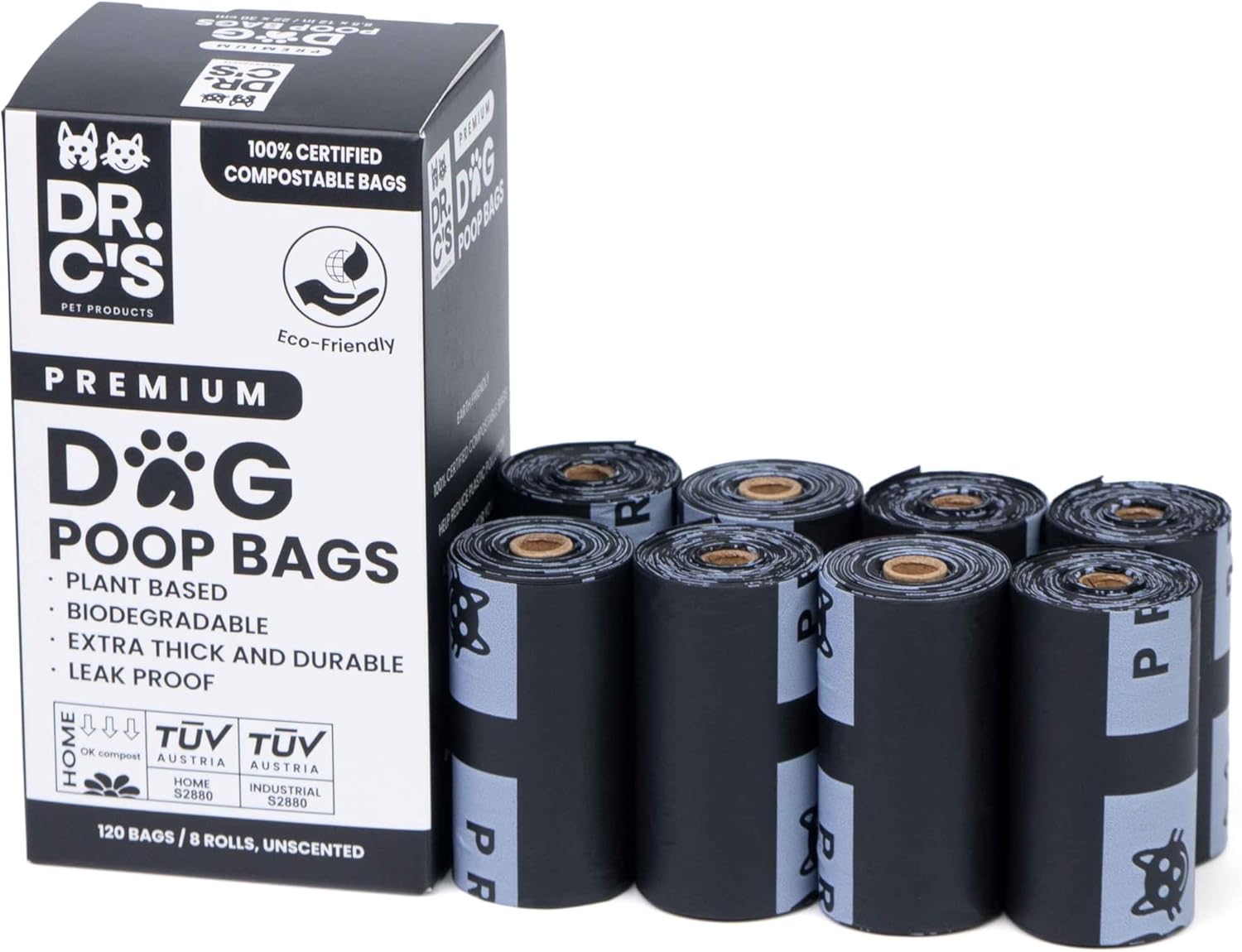 - 🌎 EARTH FRIENDLY: Dr. C's Premium Dog Poop Bags are plant based and plastic free. Our bags are 100% compostable and our packaging and cores are made out of recyclable cardboard.