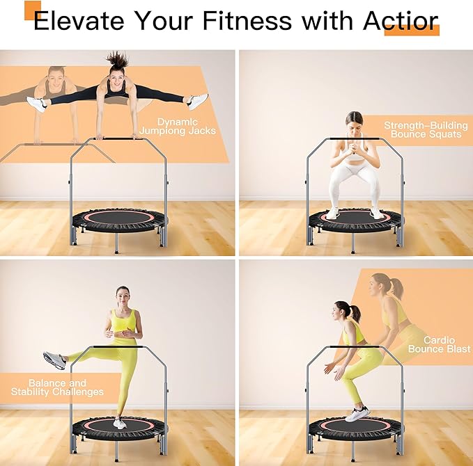 - Adjustable Height Handlebar: The trampoline is equipped with a height-adjustable handlebar that provides stability and support during your workouts. It can be easily adjusted to suit your height and fitness level.