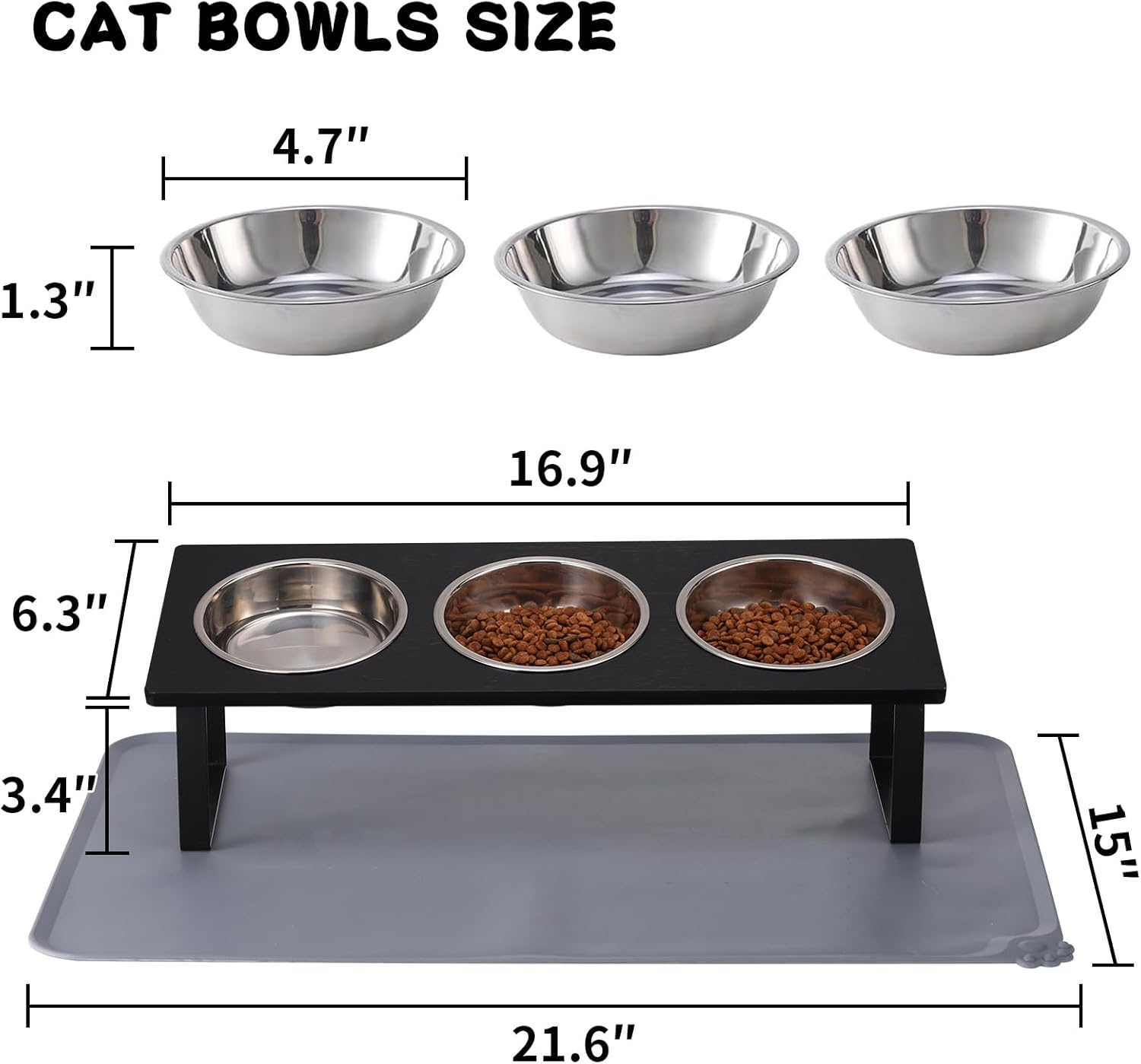Upgraded Elevated Cat Bowls with Food Mat,15°Tilted Stand Anti Vomiting Raised Cat Dishes for Food and Water,3 Stainless Steel Bowls for Cats and Puppy(Black)
