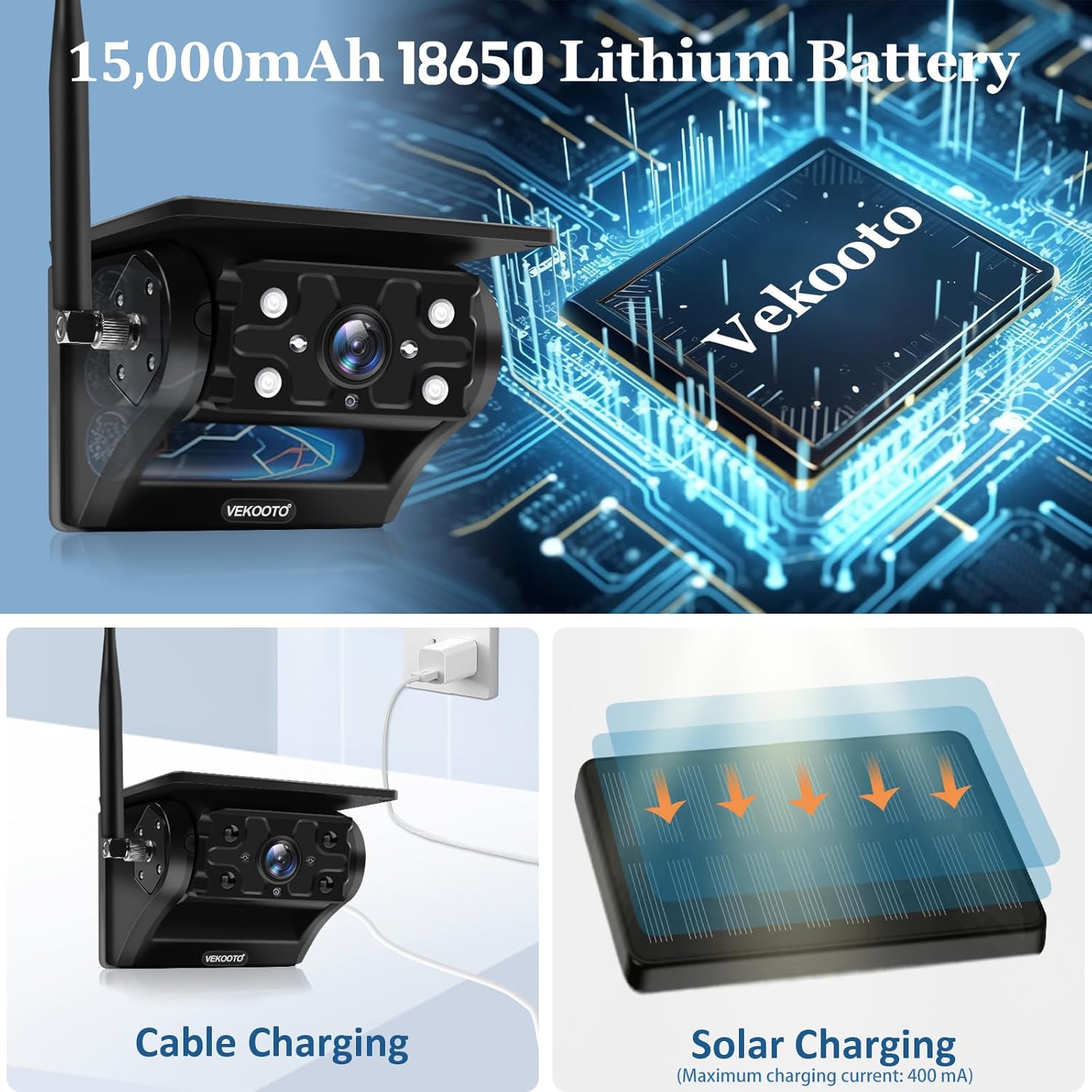 - 【15,000mAh Battery & True Solar Charging】The solar backup camera is upgraded with a powerful 15,000mAh rechargeable battery and an integrated high-efficiency solar panel. It offers up to 30 hours of continuous operation. The magnetic camera supports fast Type-C charging, and the high-efficiency monocrystalline solar panel can provide up to 400mA of current to keep the battery charged