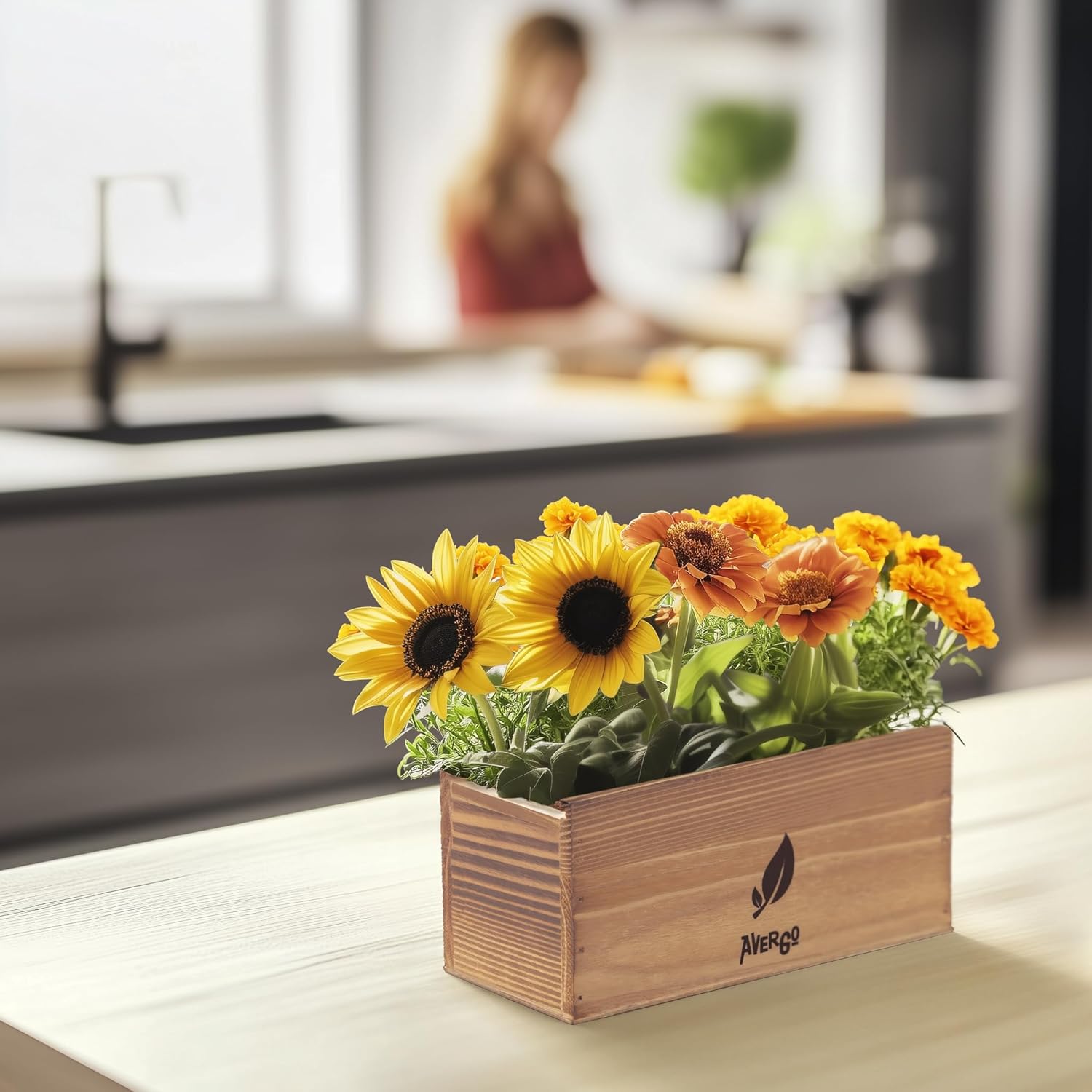 - Complete Flowers Starter Kit: Contains everything you need, including Sunflower, Marigold and Zinnia seeds, wood box, soil discs, burlaps, and tools for planting.