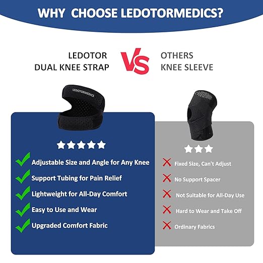 - ERGONOMIC DESIGN WITH NON-SLIP VELCRO: The dual straps ensure a perfect fit for various knee sizes, providing targeted compression and stability for both left and right knees. so it will prevent potential sports injuries without sacrificing your mobility, This knee brace patellar tendon support strap effectively prevent meniscus tears, strains, and Sprain, relieve ACL, LCL, MCL, relieve tendinitis and knee arthritis pain