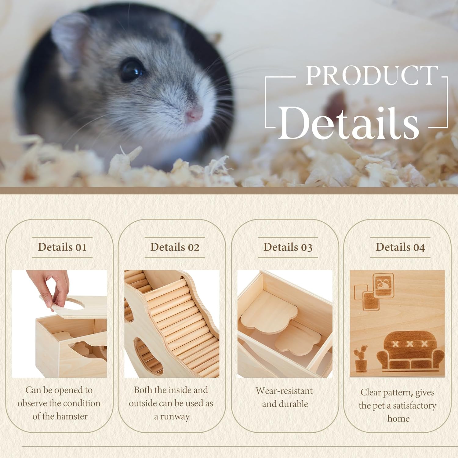 - Intricate Design with a Cozy Feel: enjoy the beautiful, clear carvings of study, bedroom, and living room design elements which create a warm, home like atmosphere for your hamster; The hamster tunnel adjac