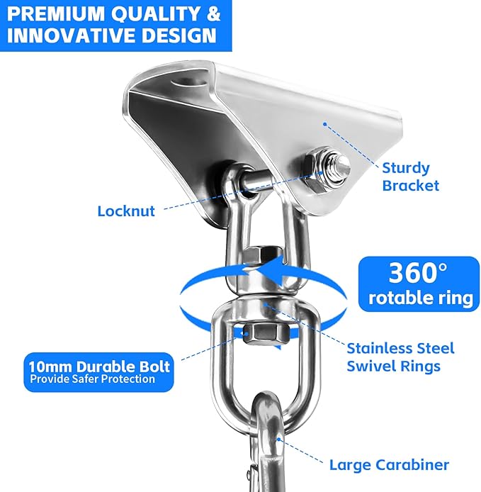- 360° Rotation: 360 degree swivel designed for heavy duty punching bag chaining and rotation with exceptional flexibility, helps take pressure off the wood beams in your garage and adds extra support. Swings and rotates with ease. Allows for a full range of motion and hitting the bag from all angles