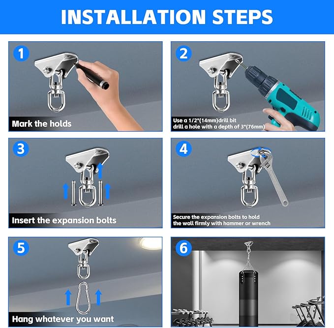 - Universal Design: Our punching bag mount suitable for concrete ceilings and wooden beams, can be used indoors and outdoors. Heavy bag hanger is not just for punching bag, it can also be used as swings, porch swings, sling swings, yoga swings, hammock, or any other swing used for playground swings