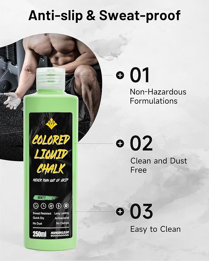 - 𝐈𝐦𝐩𝐫𝐨𝐯𝐞𝐝 𝐆𝐫𝐢𝐩 𝐟𝐨𝐫 𝐏𝐞𝐚𝐤 𝐏𝐞𝐫𝐟𝐨𝐫𝐦𝐚𝐧𝐜𝐞: Just a small drop of MANUEKLEAR liquid chalk enhances your grip, preventing slips caused by sweat or oil. With a long-lasting, strong grip, you’ll feel more confident and focused during your workouts. Boost your performance in lifting, climbing, or any grip-intensive activity, knowing your hands will stay dry and secure.