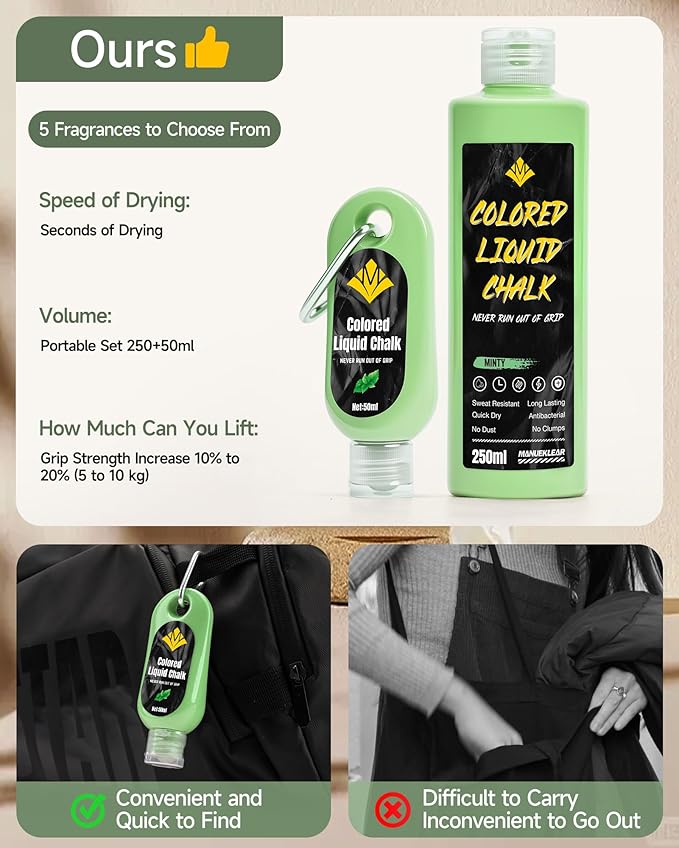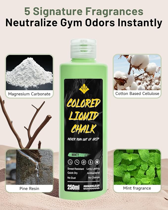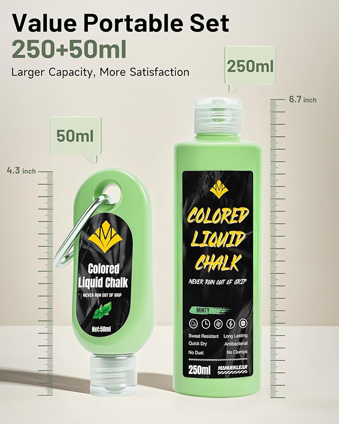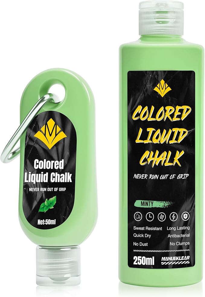 - 𝐅𝐫𝐞𝐬𝐡 𝐒𝐜𝐞𝐧𝐭𝐬 & 𝐏𝐨𝐫𝐭𝐚𝐛𝐥𝐞 𝐂𝐨𝐧𝐯𝐞𝐧𝐢𝐞𝐧𝐜𝐞: MANUEKLEAR Liquid Chalk includes a 250ml bottle plus a handy 50ml travel size. Choose from refreshing blueberry, lemon, or mint scents for a fresh experience. The small bottle clips with a carabiner onto your bag or gear, making it perfect for workouts at the gym, home, or on the go!