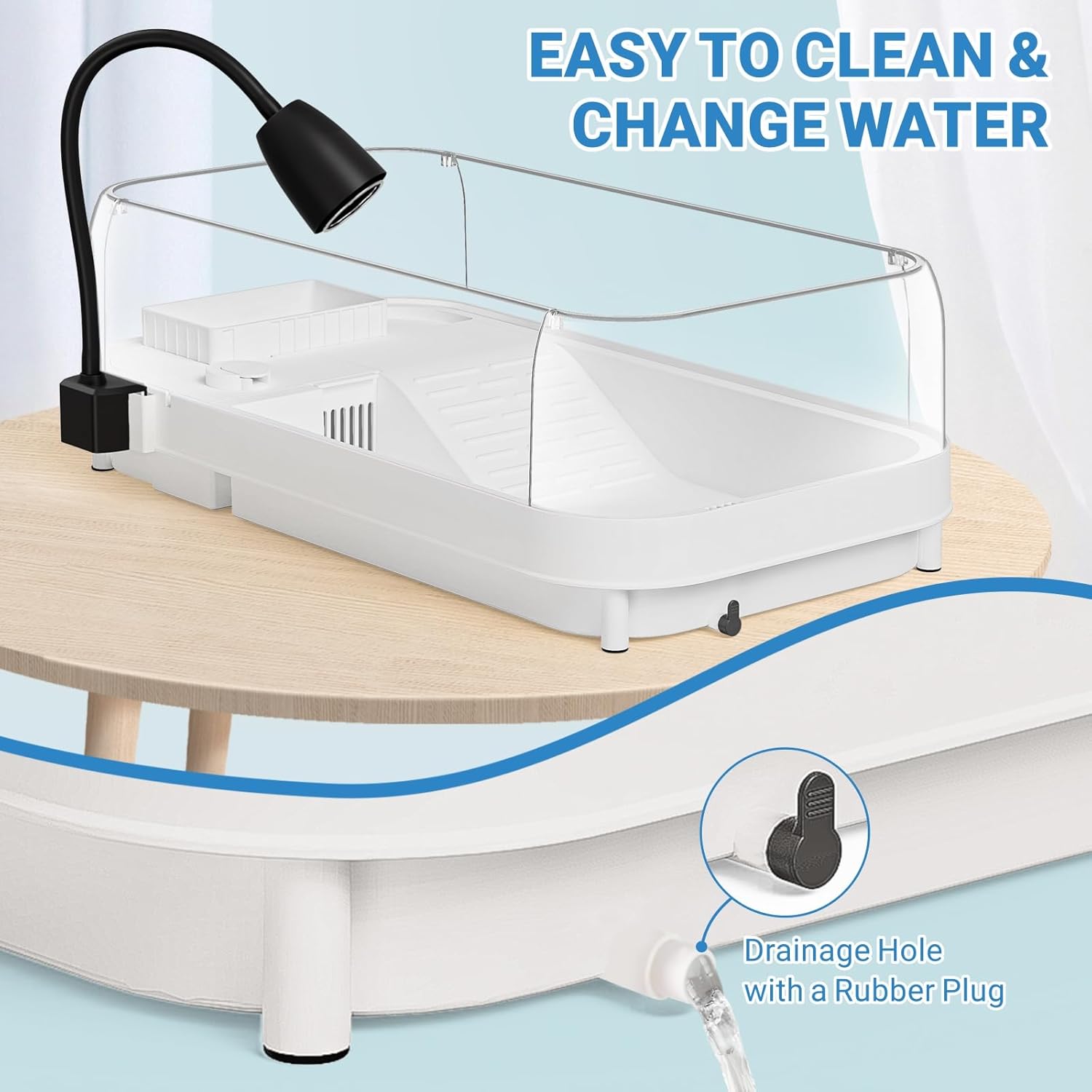 Large Turtle Tank Kit (Tank + Lamp + Filter), Acrylic Turtle Tank Starter Kit, Tank Aquarium with Heightened and Curved Fences, Bottom Drainage, Multi-Function Areas (Black Lamp)