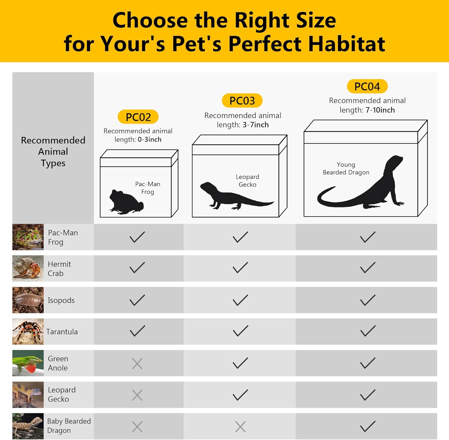 - Excellent Ventilation: The touch screen top promotes airflow and allows UVB and infrared light to penetrate, essential for your reptiles' health. With a 360-degree view, you can easily observe frogs, turtles, and crested geckos in their habitat