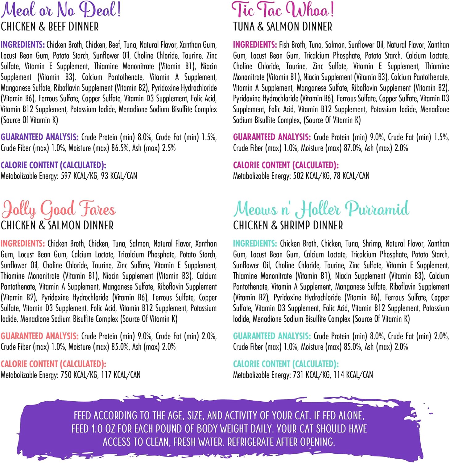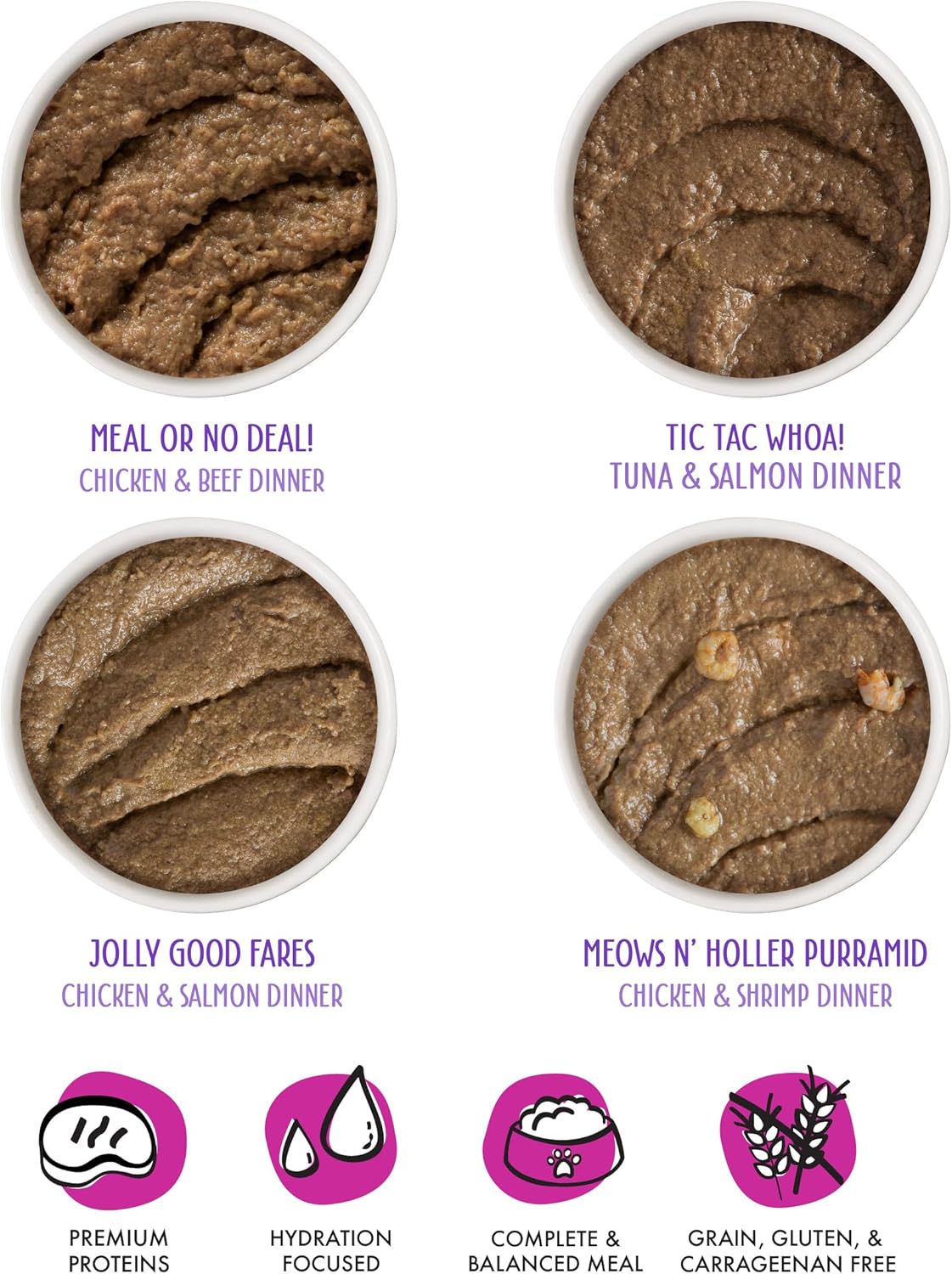 - Weruva Wet Cat Food, Grand Prize Patés Variety Pack 5.5oz, Pack of 12 includes three (3) of each: Meal or No Deal, Tic Tac Whoa, Jolly Good Fares, Meows n' Holler Purramid
