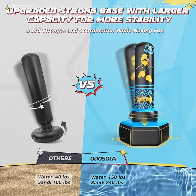 - Stable & Quick Rebound: With an upgraded base that holds up to 240 lbs of sand or 200 lbs of water, this kids punching bag remains stable during play. Its quick rebound ensures it springs back instantly after each hit, keeping kids engaged and active