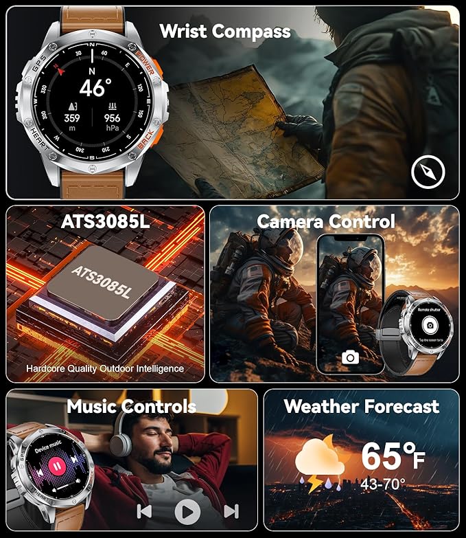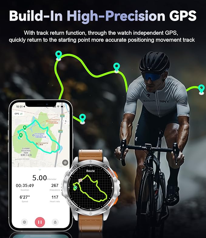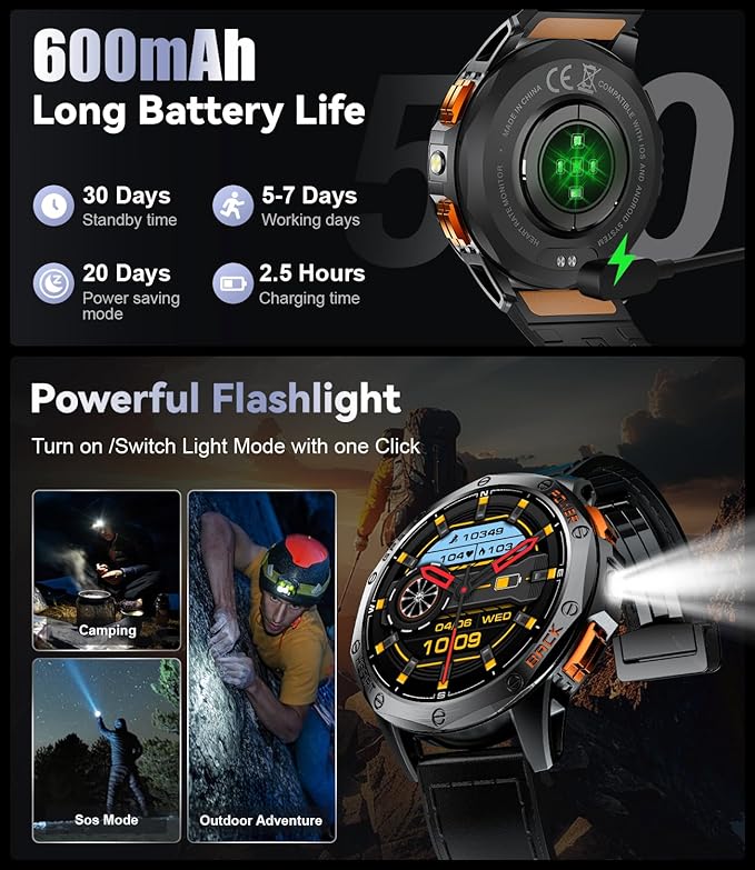 - 🧭【Compass & GPS & LED Flashlight】 This smart watch men supports a compass and GPS, as well as satellite systems including GLONASS, Beidou, Galileo, NAVIC, and QZSS, allowing you to accurately track your route during outdoor activities and providing comprehensive support for your adventures. For outdoor enthusiasts, this feature enhances safety and adds more enjoyment to outdoor activities. And the mens smart watch is equipped with a powerful flashlight function suitable for various situations. Whether you're camping at night, looking for something, or handling an emergency, the flashlight provides ample illumination. (*Note: GPS route tracking should be activated in open areas.)