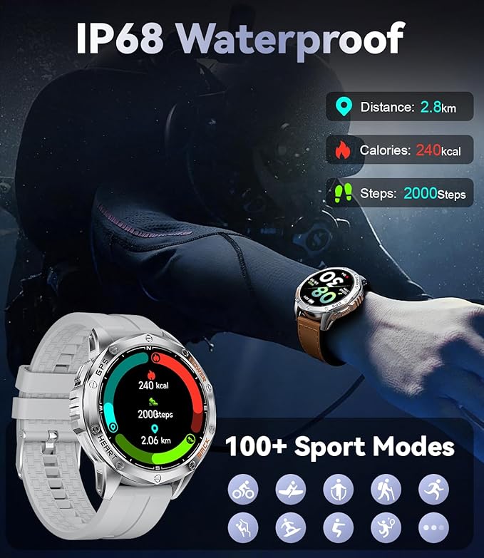 - 🏊【100+ Sports Modes & IP68 Waterproof Swimming Watch】 This fitness tracker supports up to 100 sports modes, covering a wide range of activities from fitness and running to swimming. The pedometer can monitor your steps, distance, calorie consumption, and heart rate in real time. The waterproof watch has an IP68 waterproof rating, effectively guarding against moisture intrusion, making it suitable for daily handwashing, swimming, and wearing in rainy conditions. The fitness watches for men supports swimming modes for freestyle, breaststroke, backstroke, and butterfly, perfect for water activities. Note: Not suitable for sea or diving.