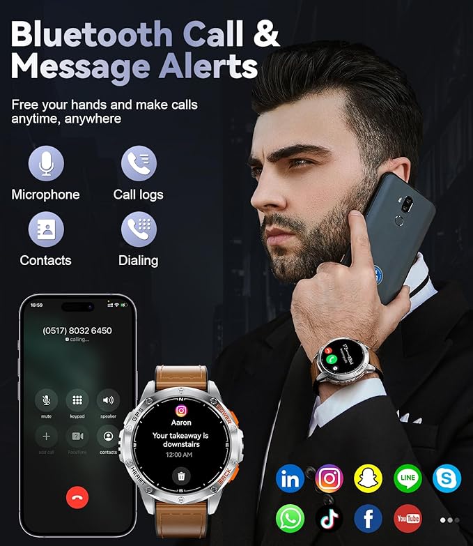 - 📞【Bluetooth Calling & Message Notifications】 This men's smartwatch features advanced Bluetooth 5.3 technology, allowing you to easily answer and reject calls. The smartwatch for men is equipped with a high-quality speaker and microphone, ensuring clear conversations and greatly enhancing usability. You can also receive real-time notifications from social media apps like Facebook, WhatsApp, and Gmail. The smartwatch with calling vibration alert function promptly notifies you of new messages, ensuring you don’t miss any important information. With simple gestures, you can quickly view messages, all from your wrist, avoiding cumbersome processes.