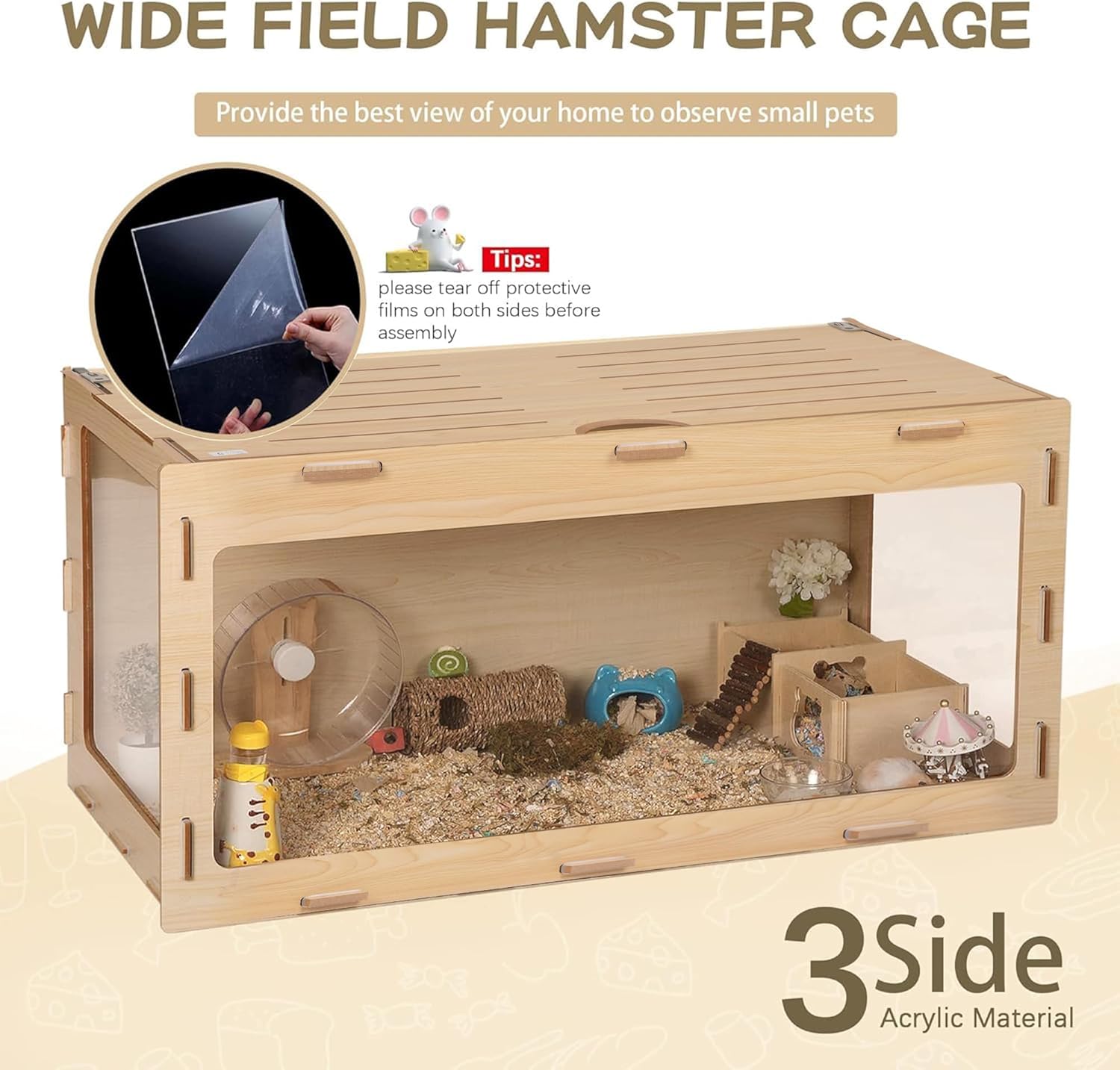 - 【Good Ventilation & Wide View】The sturdy roof that can be easily opened and the stripes-shaped opening with ample gaps ensure the cage is well-ventilated and free from odors. You don't have to worry about ventilation even when the lid is closed, allowing your furry friends to enjoy fresh air. This wooden hamster cage features three clear acrylic walls that make it easy to observe all the fun activities your little pals are up to! Plus, weighing in at 16.4 LBS, it can be easily moved by one person