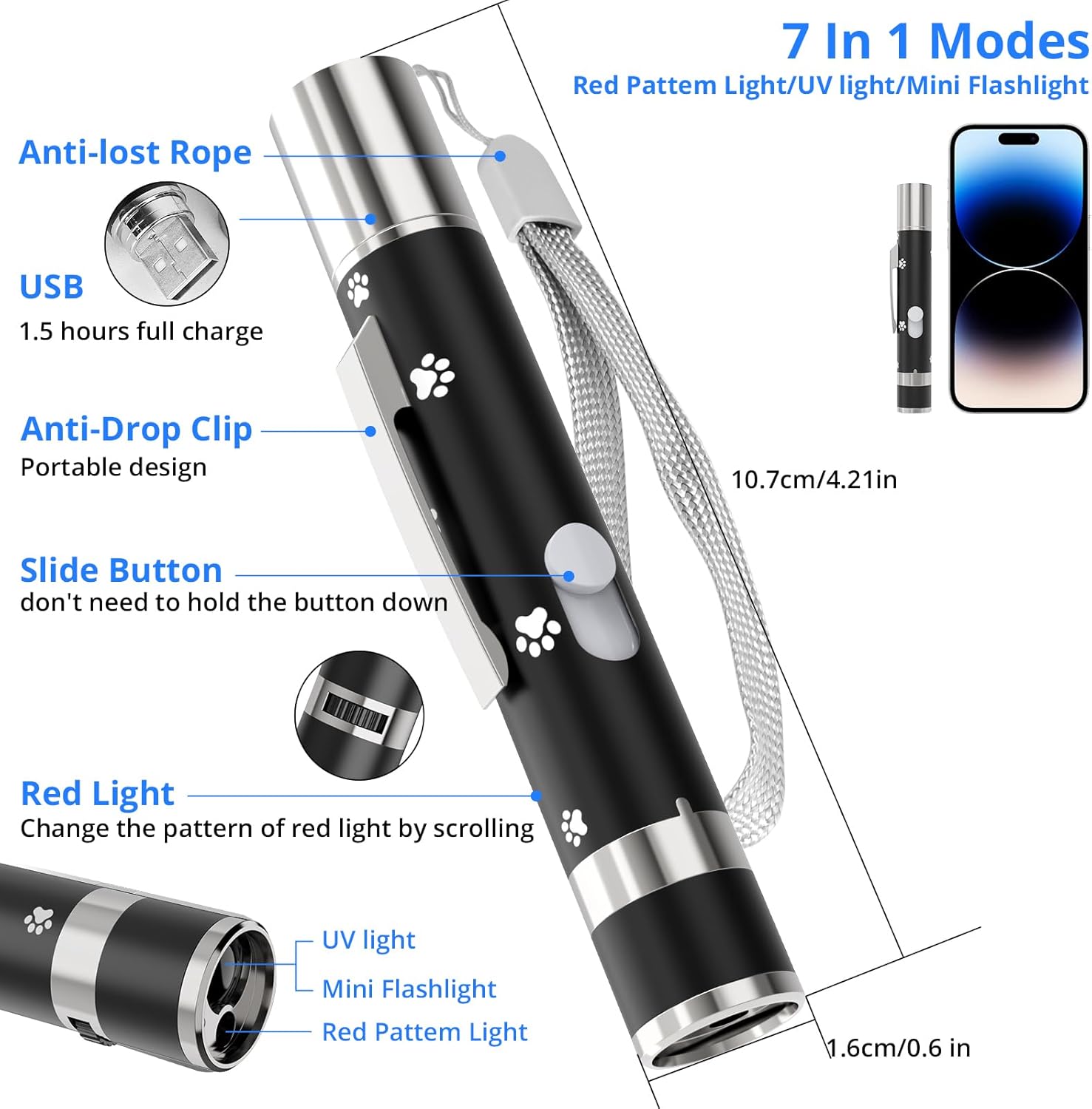 - 【Versatile Functionality】This cat wand toy is more than just a pet accessory. It doubles as a presentation pointer with a bright beam for clear visibility. Easily activate it with a single push—no need to hold the button continuously. It also features a glow-in-the-dark light mode and a purple mode for detecting counterfeit money.