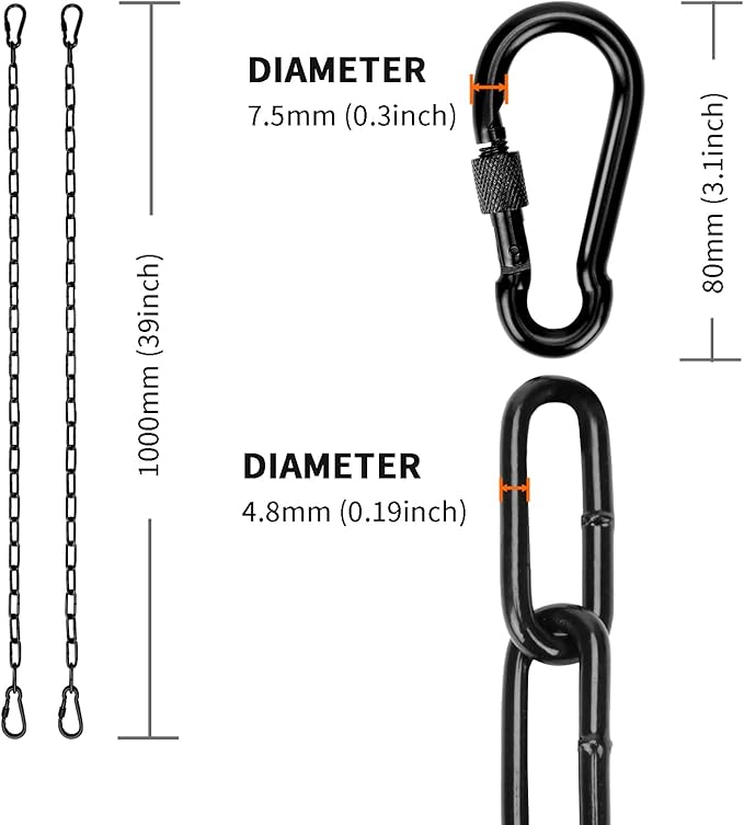- High Quality Stainless Steel Material : Our hanging chair chain is made of high-quality stainless steel raw materials, much stronger than ordinary metal chains, non-rusting, corrosion resistance, high hardness, providing more stable, smoother and safer suspension. This means that even in adverse weather conditions, your hammocks chain, swings chain, and pull-ups chain, punching bags sandbag chain, gate chain will maintain its original appearance