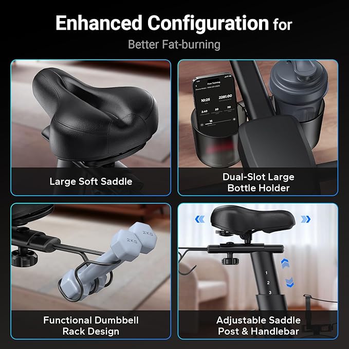 - QUIET PERFORMANCE: Designed for home use, the multi-slot silent belt drive and iron sand flywheels work together to deliver a smooth, whisper-quiet ride, operating at less than 25 dB. Whether you're working out early in the morning or late at night, this stationary exercise bike ensures a peaceful environment for both you and your family