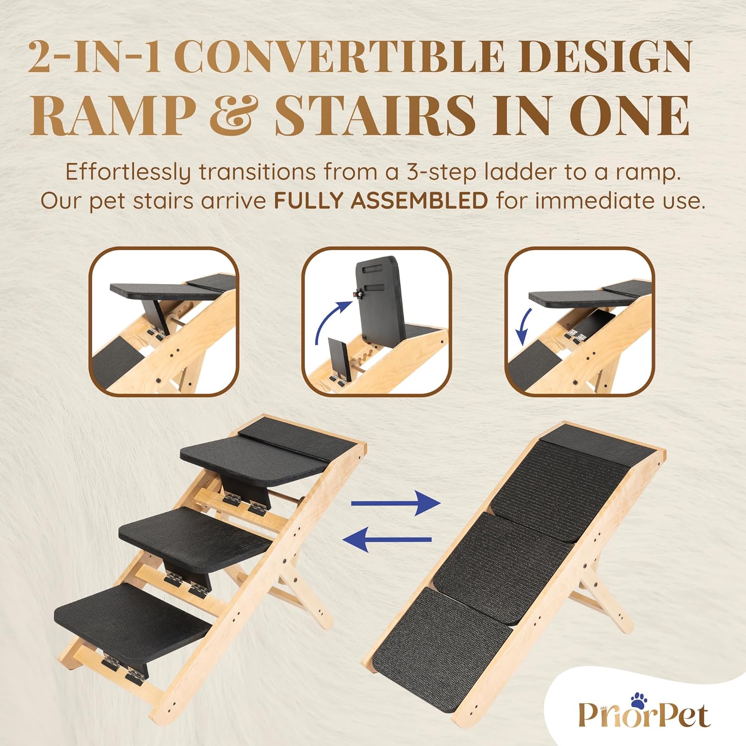 - 2-IN-1 CONVERTIBLE DESIGN: RAMP & STAIRS IN ONE: Easily switch between dog steps for bed and dog ramp for couch to suit your pet's needs, making it the perfect stairs for dogs to get on bed, ensuring safe access to elevated areas.