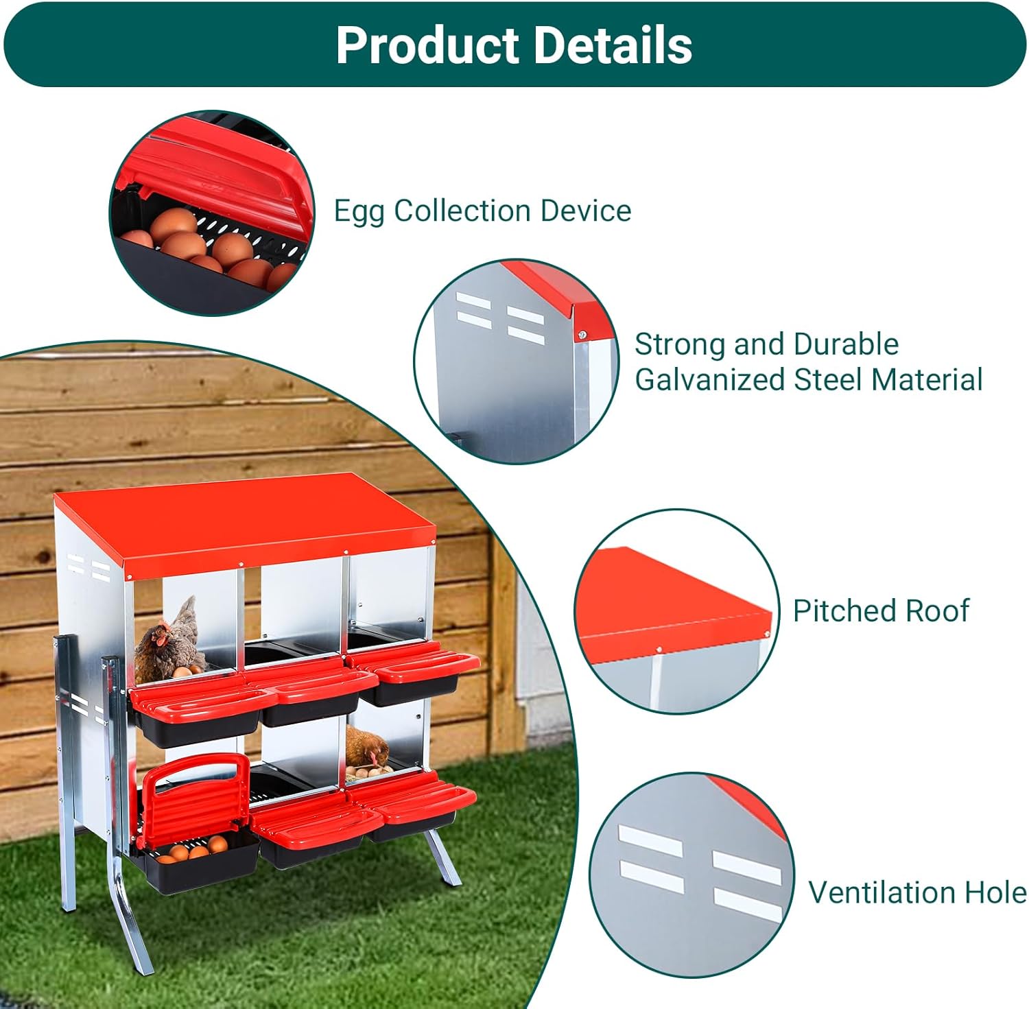 - CONVENIENT EGG COLLECTION MECHANISM: The unique tilting design of this nesting box allows the eggs to roll automatically into the collection tray for quick and easy egg collection. Say goodbye to tedious manual egg picking, you can easily access fresh eggs while ensuring they are intact.
