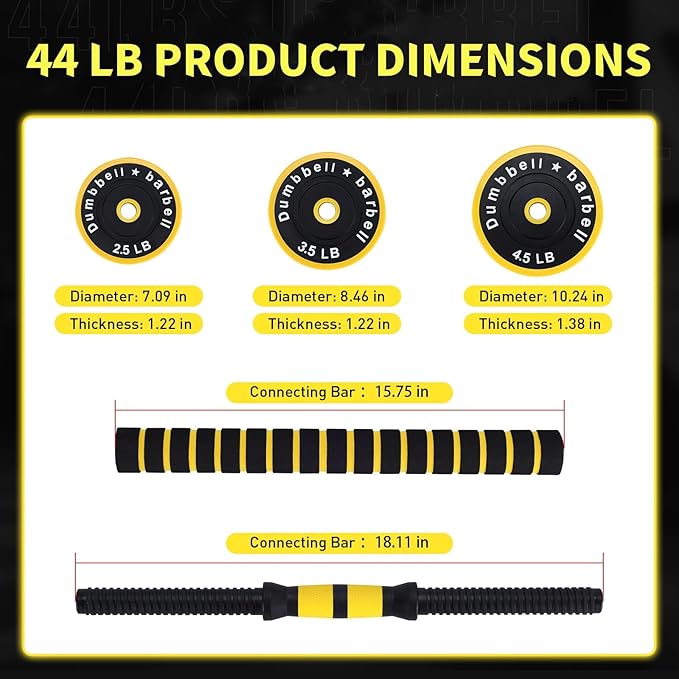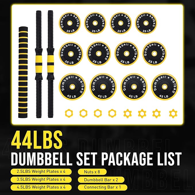 - 44 LB Package Included: 4 x 4.5 lb dumbbell weight plates, 4 x 3.5 lb dumbbell weight plates, 4 x 2.5 lb dumbbell weight plates,2 x dumbbell bars, 1 x connecting rod, 8 x nuts.