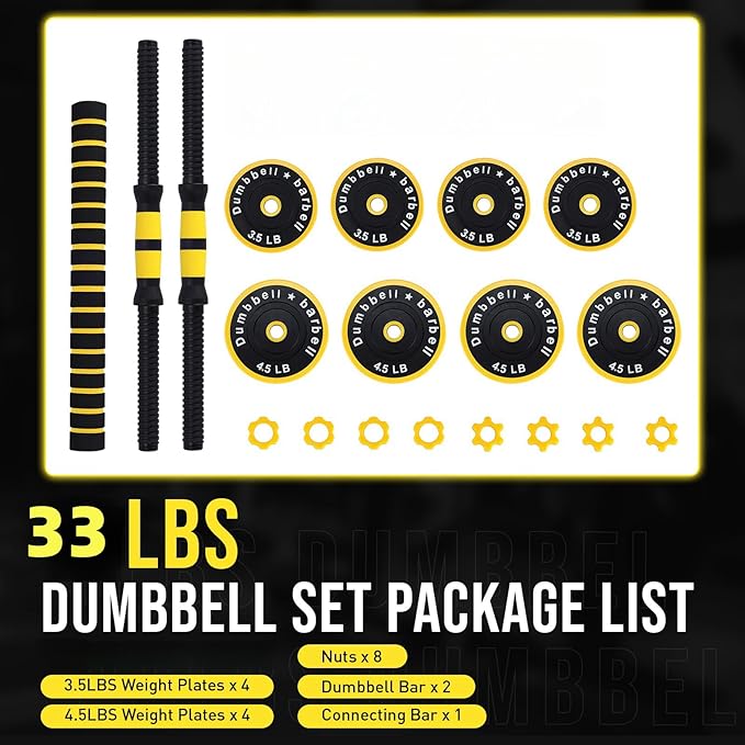 - 33LB Package Included: 4 x 4.5 lb dumbbell weight plates, 4 x 3.5 lb dumbbell weight plates, 2 x dumbbell bars, 1 x connecting rod, 8 x nuts.