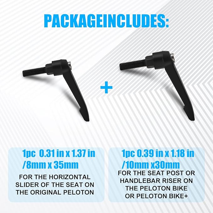 - Package Contents: You will receive 2 exercise bike adjustment handle replacements, The 8mm x 35mm handle is Compatible with Peloton Original Bike seat sliders, and the 10mm x 30mm handle is for Peloton Original Bike and Bike + seat post or handlebar rises