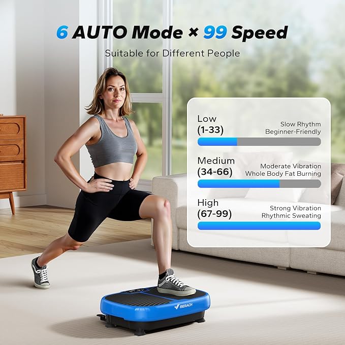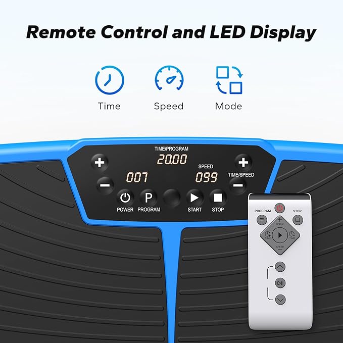 - [Diversified Training] The vibration plate provides 99 speeds and 6 automatic modes. Whether you are a beginner or an experienced sports enthusiast, you can find the training intensity that suits you best. It comes with two tension ropes to help you add upper body strength training to vibration training. It is equipped with remote control and screen button dual control modes for easy operation. The LED display shows in real time, allowing you to understand your training situation at a glance.