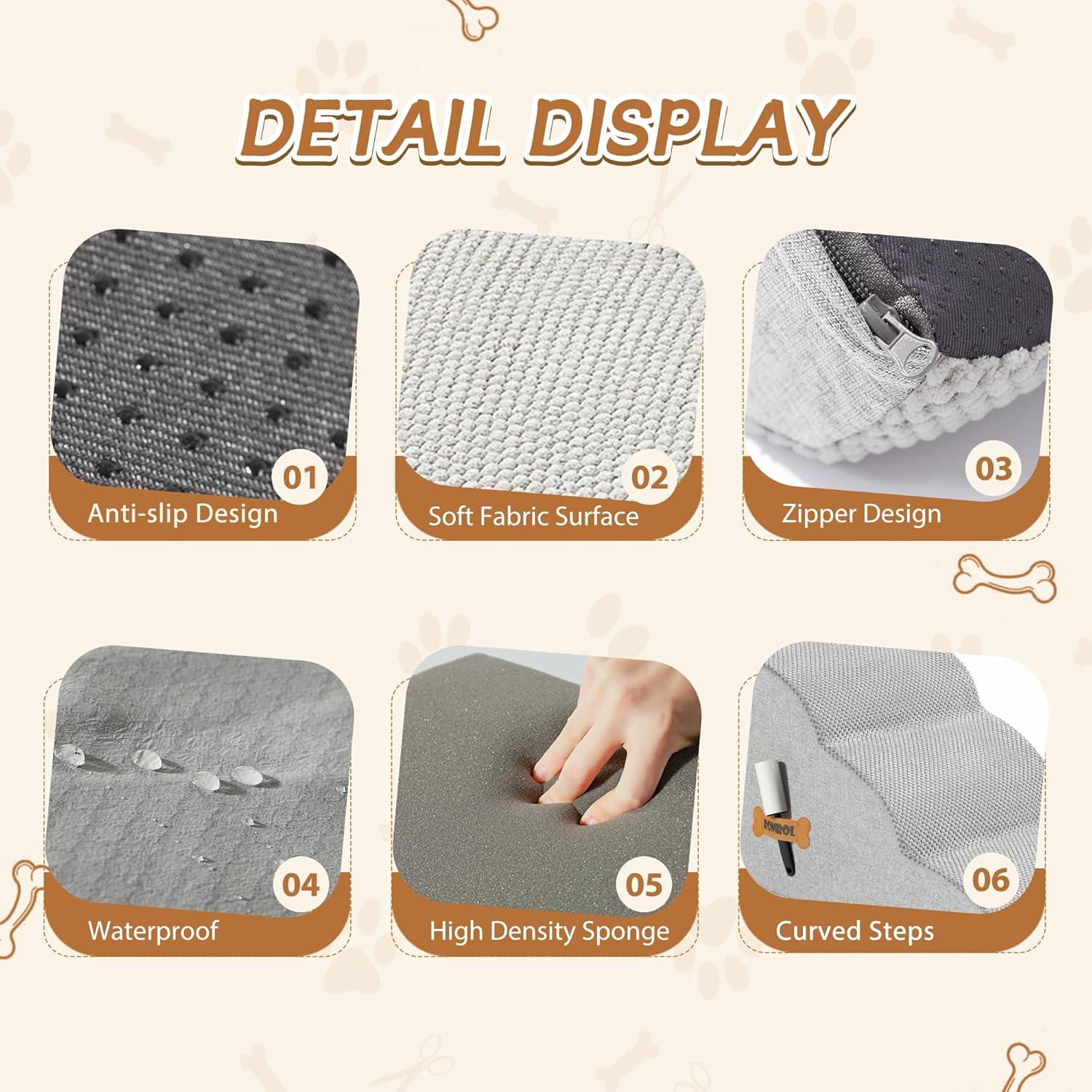 - SOFT 3 STEP RAMP SYSTEM: 3-step ramp design (14.9"x17.9"x13.5") reduces impact on paws by 58%. With breathable elastic wraps that mold to your foam's shape while maintaining scratch resistance. Machine-washable cover included. But, please note that the inner foam is not washable