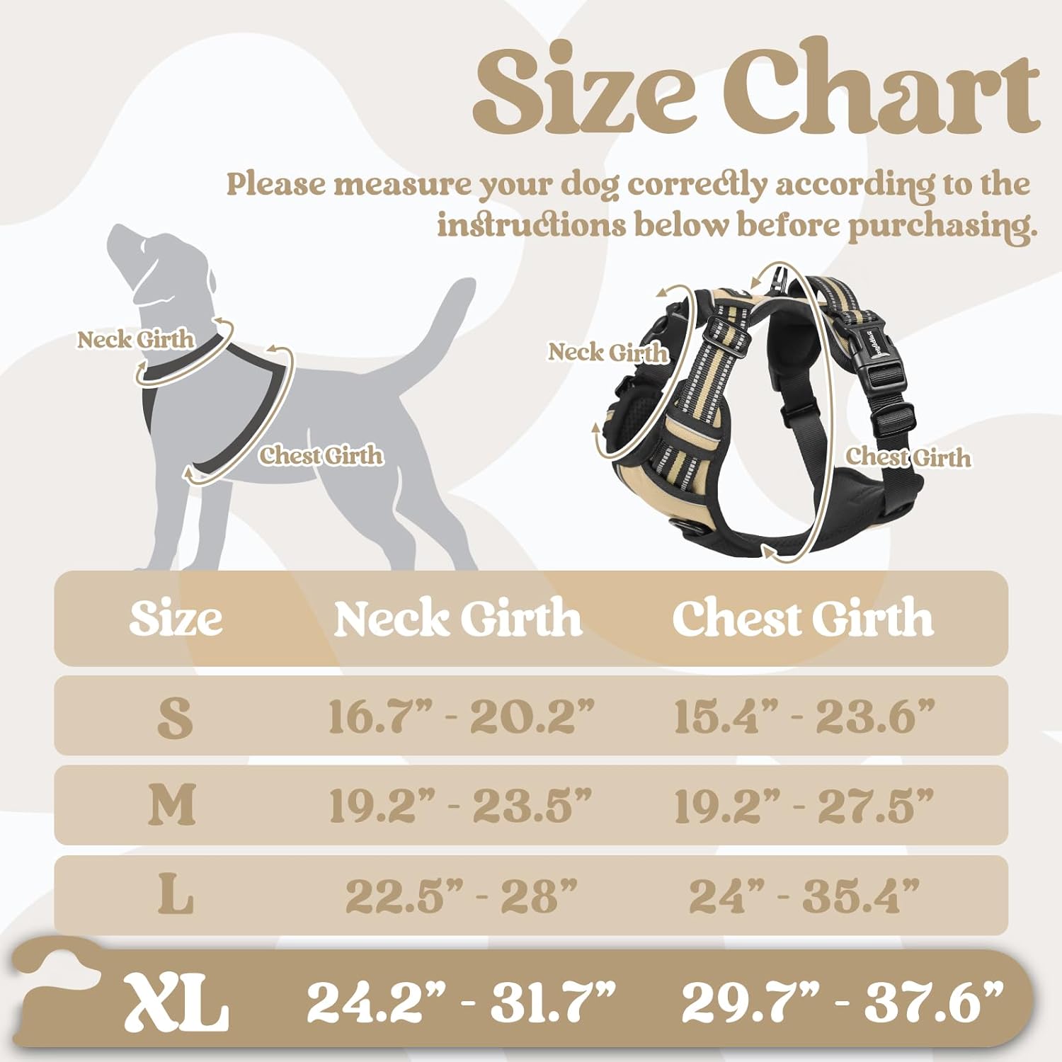 - Create a Snug Fit: 4 fully adjustable straps suit most breeds, fitting while allowing freedom of movement. The adjustable two chest straps and two neck straps were created specifically for dogs going through a fast growth period. Size information: 24.2"- 31.7" Neck Girth, 29.7"- 37.6" Chest Girth