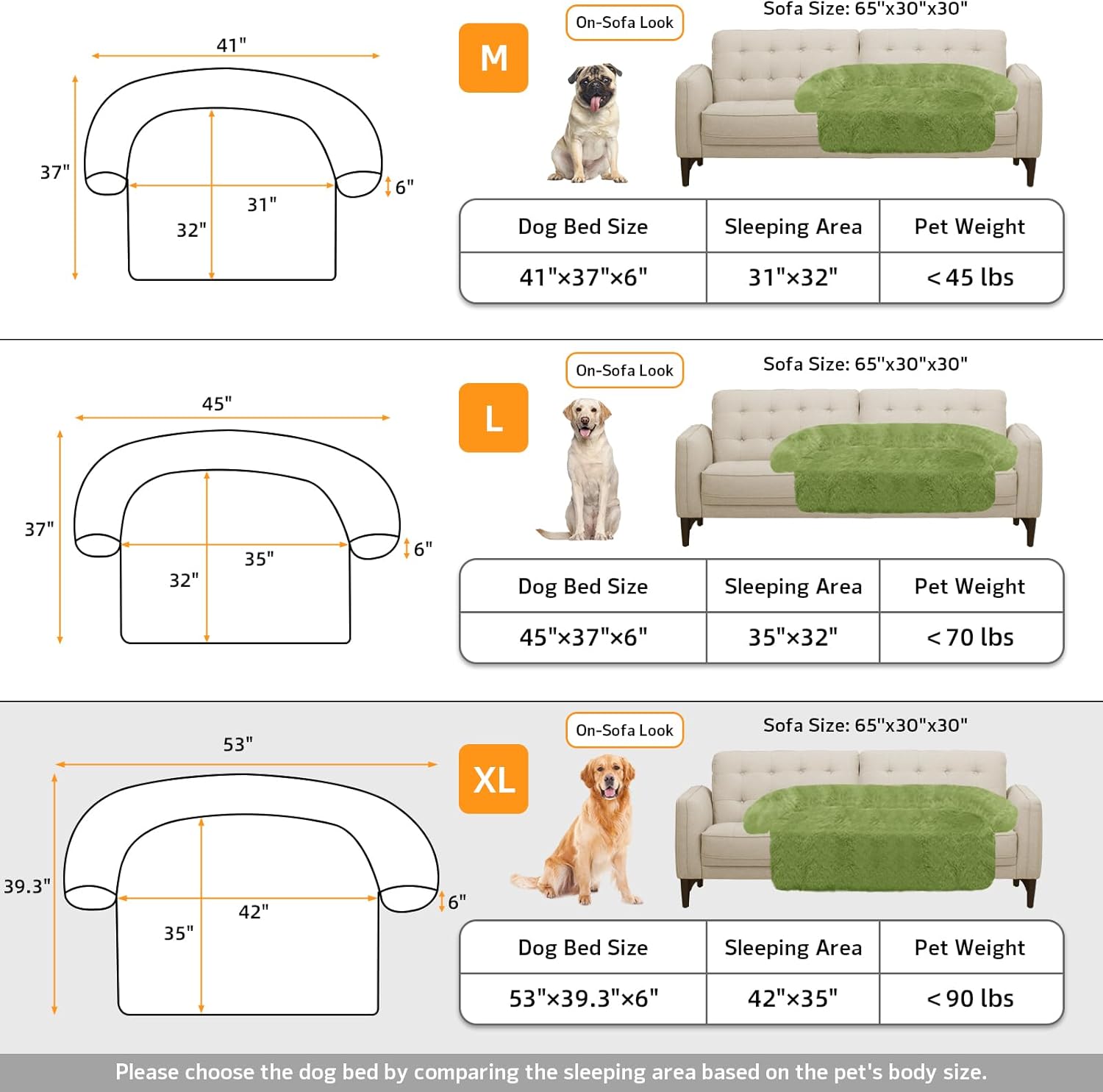 - 【Multiple Size Selection】The couch pet bed has 5 sizes for you to choose from. M: 41"x37" dog bed for medium dogs. L: 45"x37" dog bed for large dogs. XL: 53"x39.3" dog bed for large dogs. We have enlarged the sleeping area for pets to give dogs more space.
