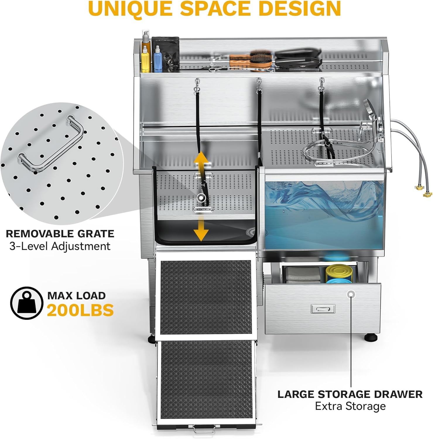 - Easy Entry: The foldable, slide-out ramp of our pet washing station also be used as a secure door, enhancing pet safety; It comes with a 3-tier, 2-piece adjustable grate that can hold up to 200lb, facilitating pet entry and exit