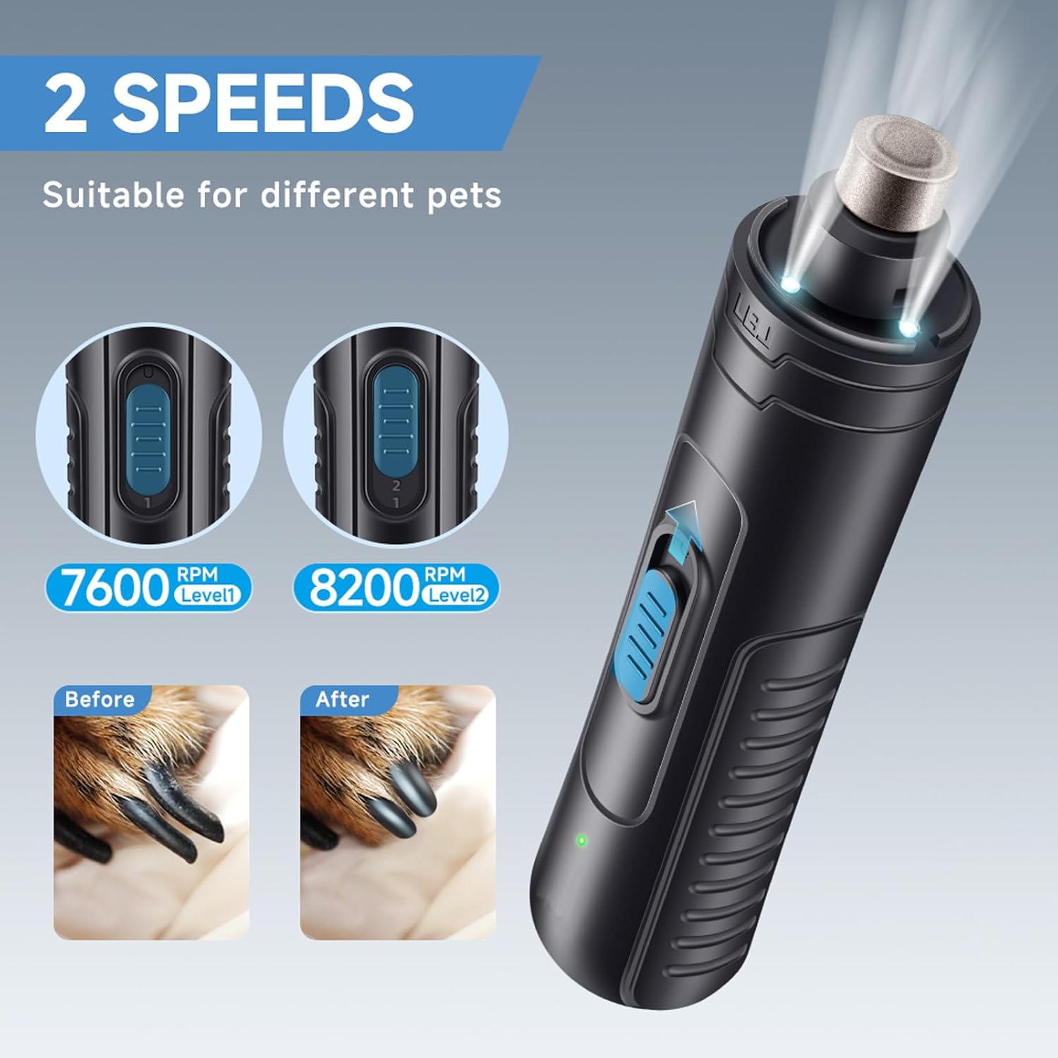 - Powerful Motor & 2-speed switch: 2-speed switch provides you with two rotation modes with high and low speed, so you may decide to start grinding qucikly according to the hardness of your pets' nail.